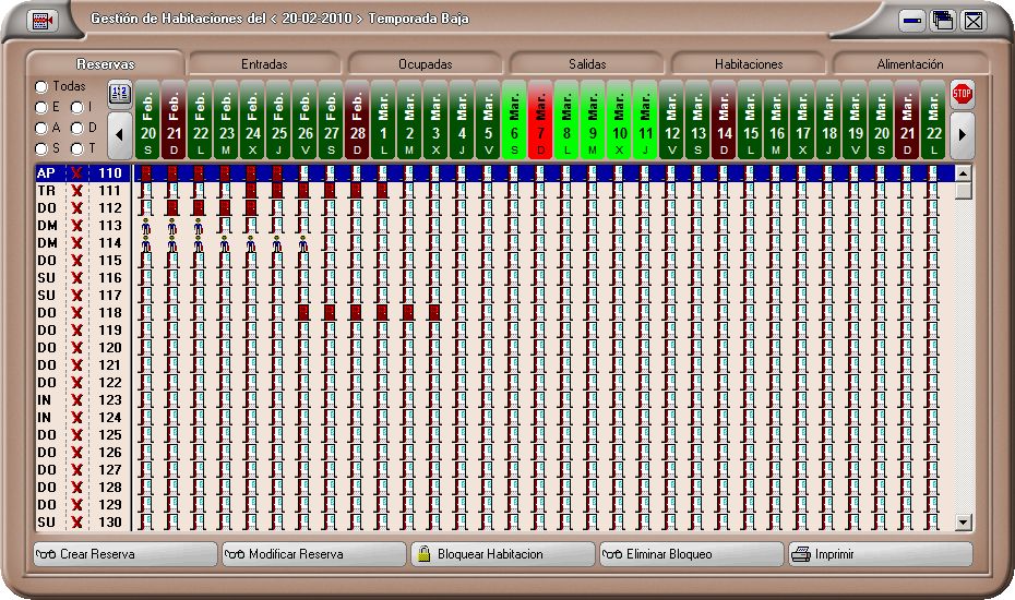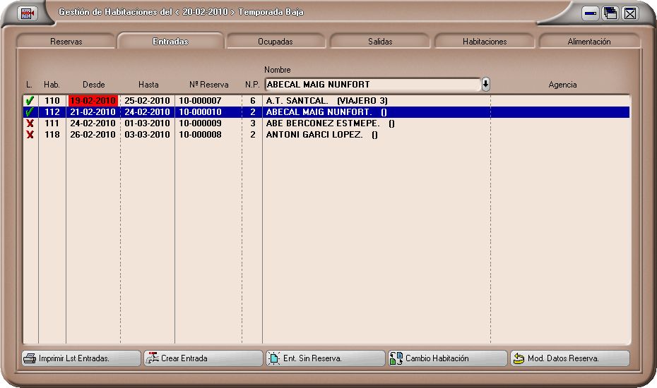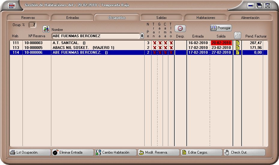 Detalle de la ventana de gestión de las habitaciones, con la ficha de los ocupadas. |