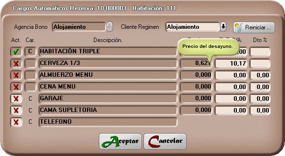 Detalle de la ventana de gestión de las habitaciones, con la ficha de reservas. |