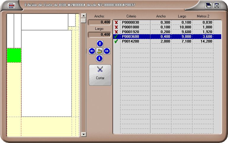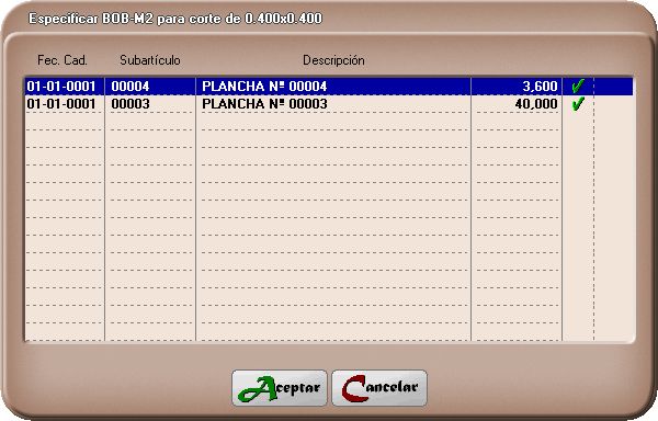 Ventana en la cual nos muestra las planchas o silimares disponibles para realizar un corte, en orden de conveniencia. |